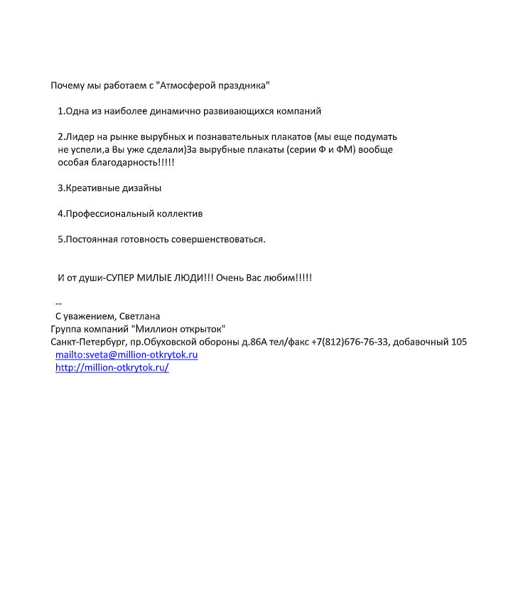Нашу поздравительную продукцию отличают яркий дизайн, качественное полиграфическое исполнение, разнообразие отделок. Мы сотрудничаем с лучшими иллюстраторами страны и используем новые и интересные фишки полиграфии.